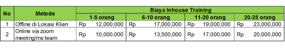 *Inhouse training dilokasi klien, biaya diatas belum termasuk transportasi dan akomodasi tim MK ke lokasi